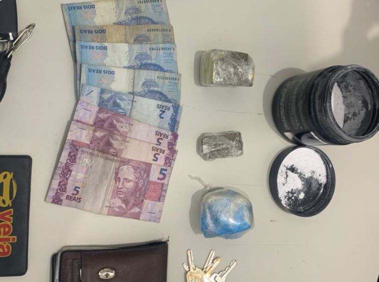 Com o investigado foram apreendidos um pacote contendo aproximadamente 100 gramas de substância semelhante à cocaína, dois pequenos tabletes contendo substância semelhante à maconha, um recipiente preto contendo creatina (comumente utilizada para aumentar o volume da cocaína), um aparelho celular, um automóvel, entre outros objetos.