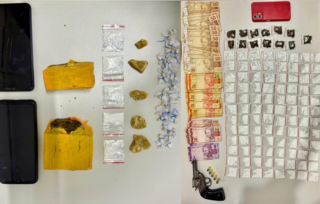 Na ação, também foram apreendidas porções de maconha, cocaína e crack, além de uma arma de fogo e uma quantia em dinheiro fracionado.