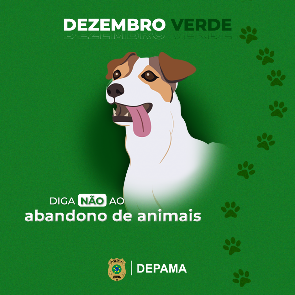 A Delegacia de Proteção Animal e Meio Ambiente (Depama) aderiu à campanha Dezembro Verde, fruto do projeto de Lei 5.481/20, que institui ações de conscientização contra o abandono de animais. A campanha reforça a preocupação com os maus-tratos contra os animais e chama a atenção para o problema do abandono de cães e gatos, em parques, avenidas, ruas e demais localidades das cidades brasileiras, prática que tem sido enfrentada pela Secretaria da Segurança Pública (SSP), por meio das Polícias Civil e Militar.
