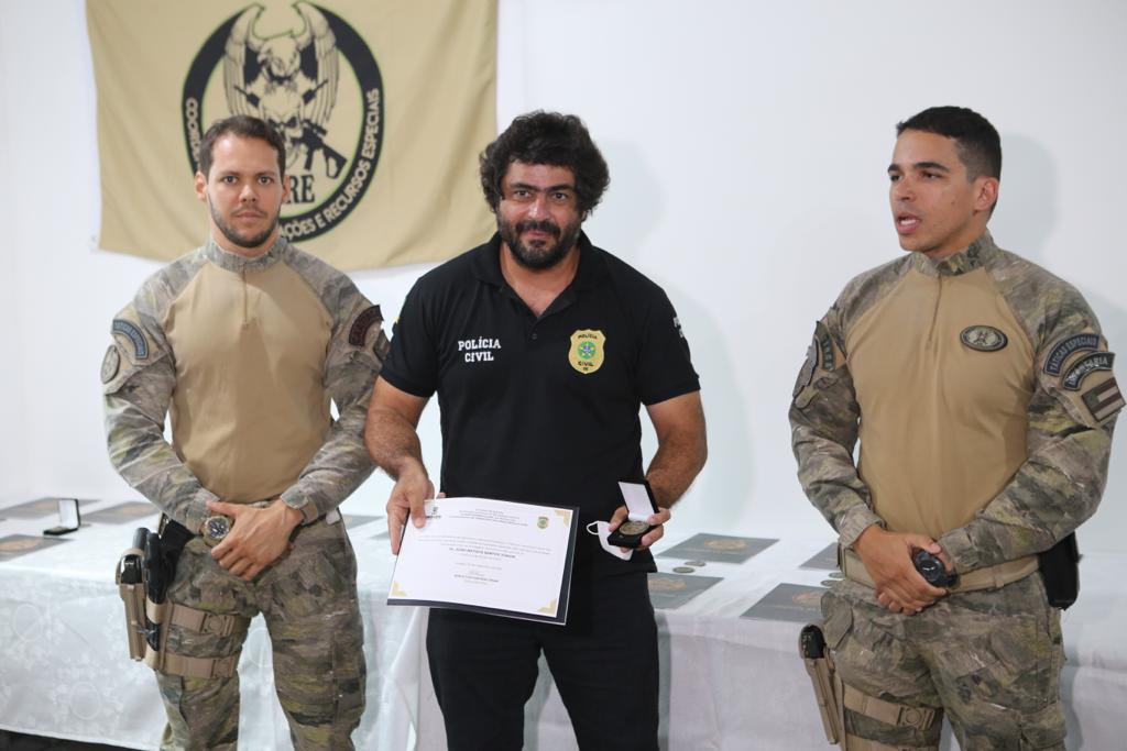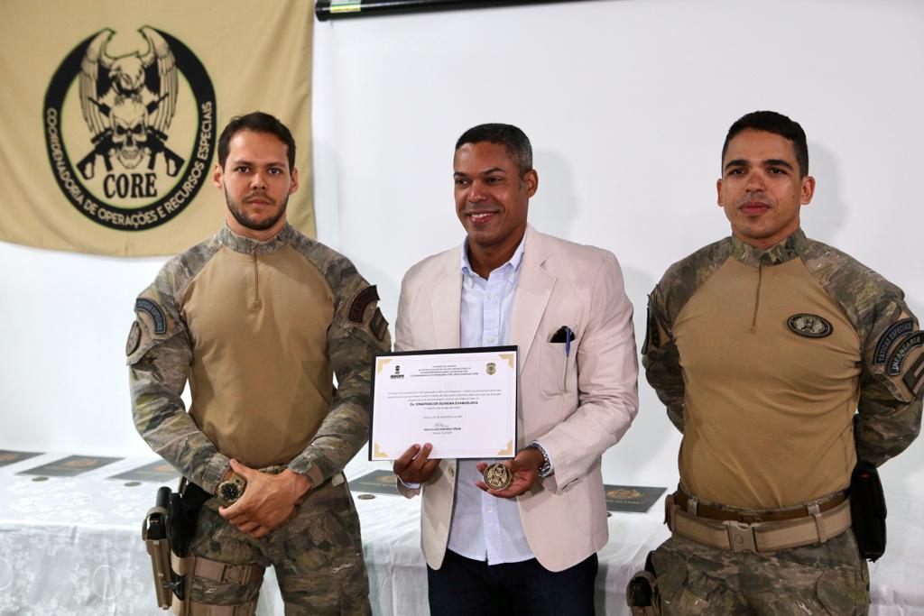 No encontro desta terça-feira, foram homenageadas 18 autoridades, dentre elas o secretário da segurança pública, João Eloy; o diretor do Departamento de Administração e Finanças da SSP, delegado Jocélio Fróes, delegado-geral, Thiago Leandro; a vice-prefeita, Katarina Feitoza; dentre outros diretores de departamentos pela alta relevância que possuem na Core, fornecendo segurança jurídica e materiais de qualidade para a operação. O Núcleo de Comunicação da PC também recebeu um diploma e uma medalha da coordenadoria.
