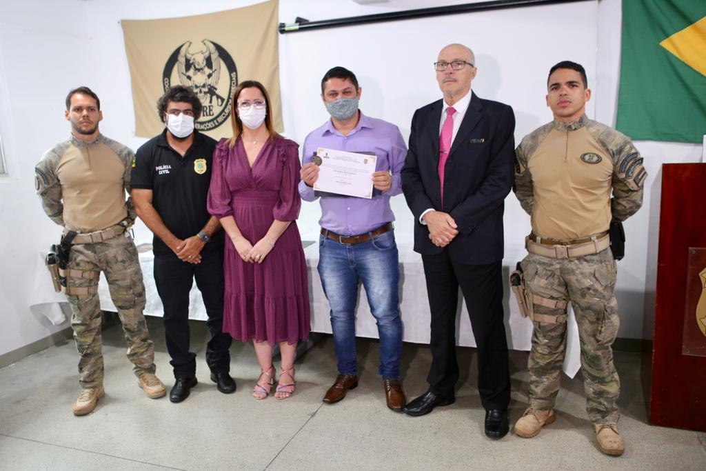 Ao final do evento, o delegado Marcelo Hercos também foi homenageado in memorian, com a presença da mãe, Marlene Hercos, e da esposa, Bartira Maia Cunha. Elas receberam uma medalha póstuma em homenagem ao delegado.