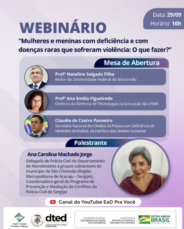 O webinário acontece nesta quarta-feira (29), às 16h. O evento conta com a participação do reitor da Universidade Federal do Maranhão (UFMA), Natalino Salgado Filho, a diretora de tecnologia na educação da UFMA, Ana Emília Figueiredo, e o secretário Nacional dos direitos da Pessoa com Deficiência, Cláudio de Castro Panoeiro.