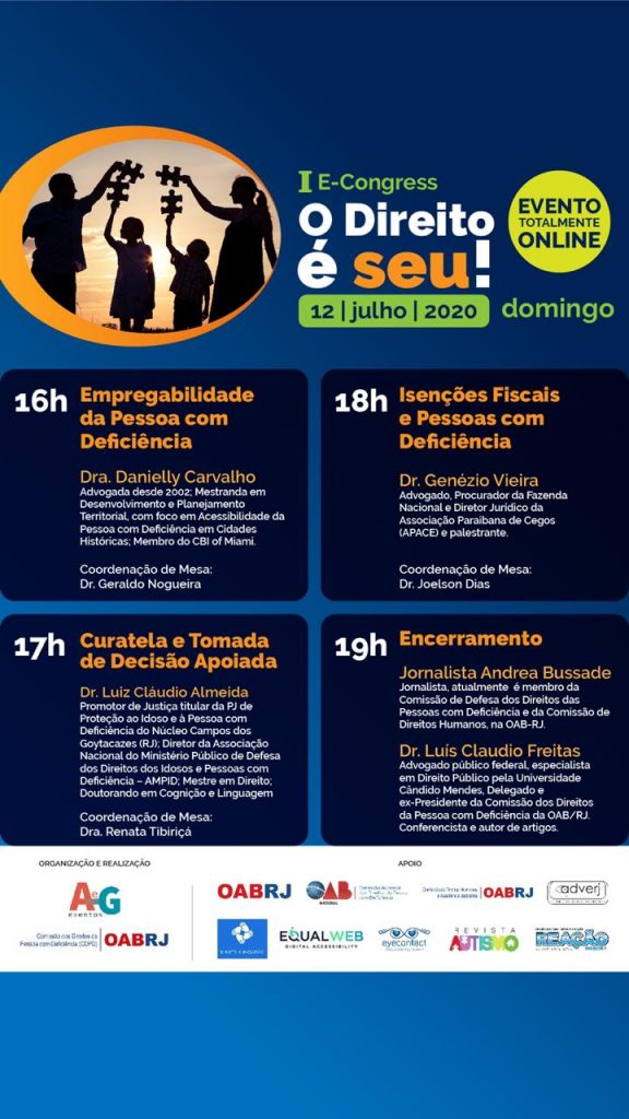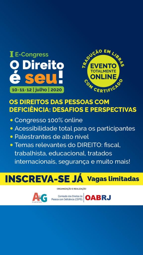 O congresso ocorre de forma totalmente on-line, nos dias 10, 11 e 12 de julho. No evento, além do delegado, outros especialistas participarão de seminário em diversas áreas do Direito da pessoa com deficiência, abrangendo temas como fiscal, trabalhista, educacional, tratados internacionais e segurança.