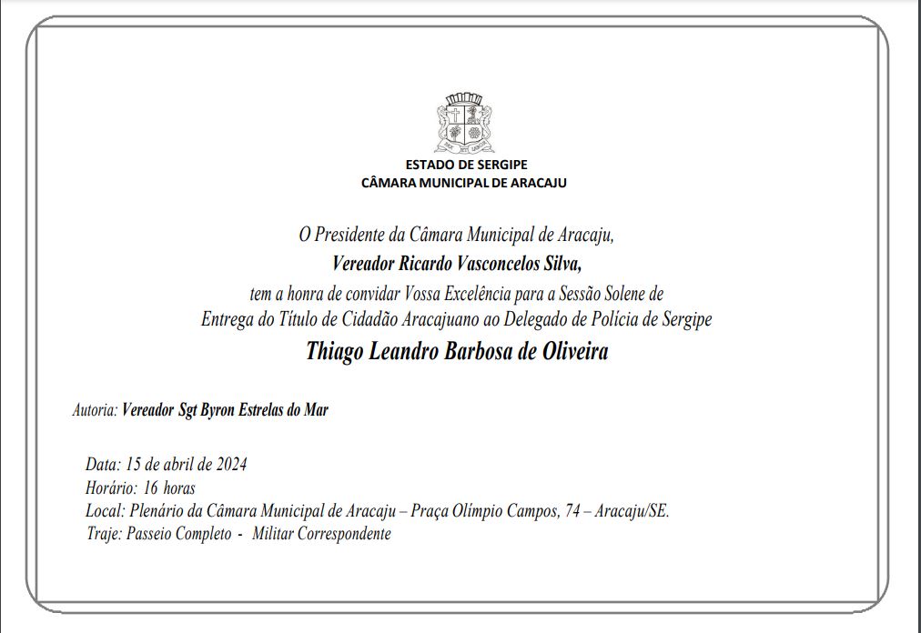 A propositura de condecoração de título de cidadão aracajuano ao delegado-geral Thiago Leandro é de autoria do vereador sargento Byron. O título foi aprovado pela Casa Legislativa municipal e será entregue ao delegado-geral da Polícia Civil de Sergipe na segunda-feira.