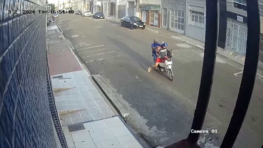 O suspeito de fazer os disparos de arma de fogo sobe em uma motocicleta de cor branca, pilotada por outro homem que estava de camisa escura e bermuda vermelha. Em seguida, ambos fogem do local do crime.