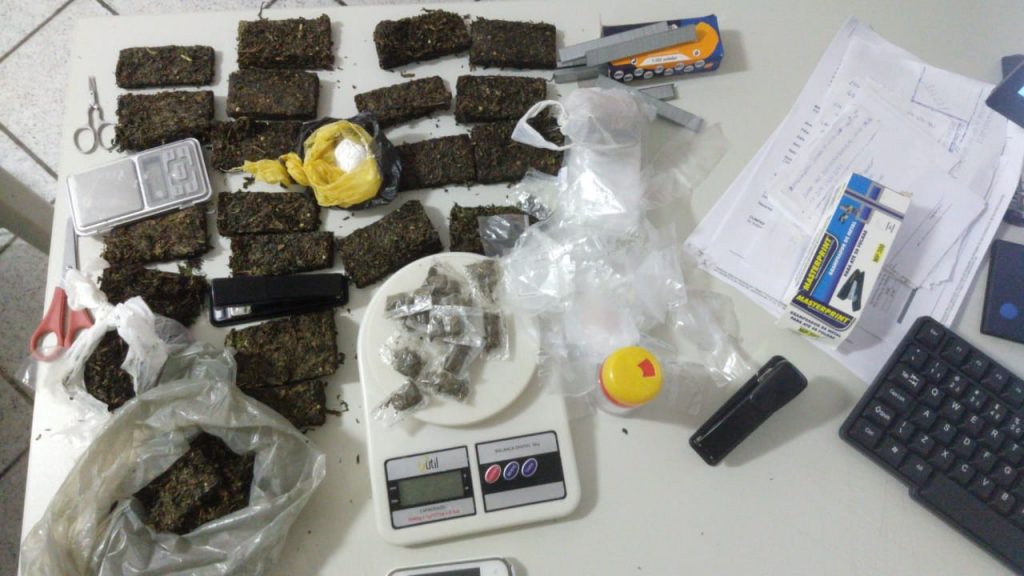 Erik do Nascimento e Vitor Bruno Gomes de Oliveira estavam em posse de 100 gramas de cocaína, 500 gramas de maconha, além de duas balanças de precisão e insumos para preparo e venda de drogas. Foram encontrados também R$100,00 em espécie.