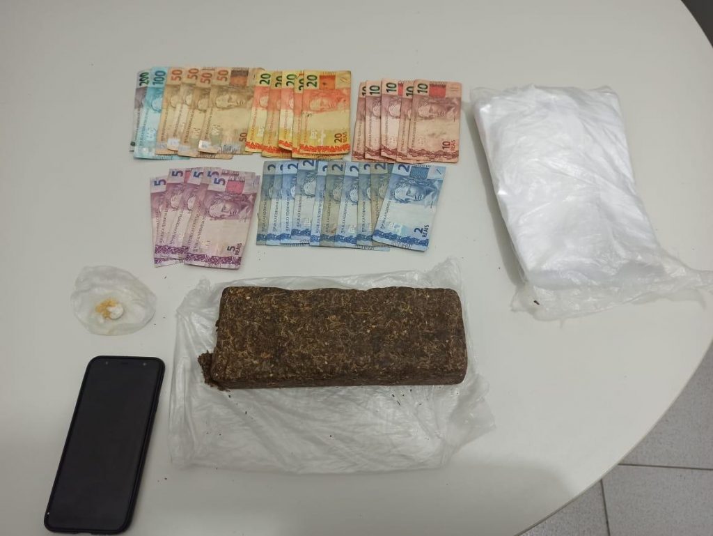 Com o investigado, os policiais apreenderam um tablete de substância semelhante à maconha, uma porção contendo substância semelhante ao crack; além de R$ 715 em notas fracionadas.