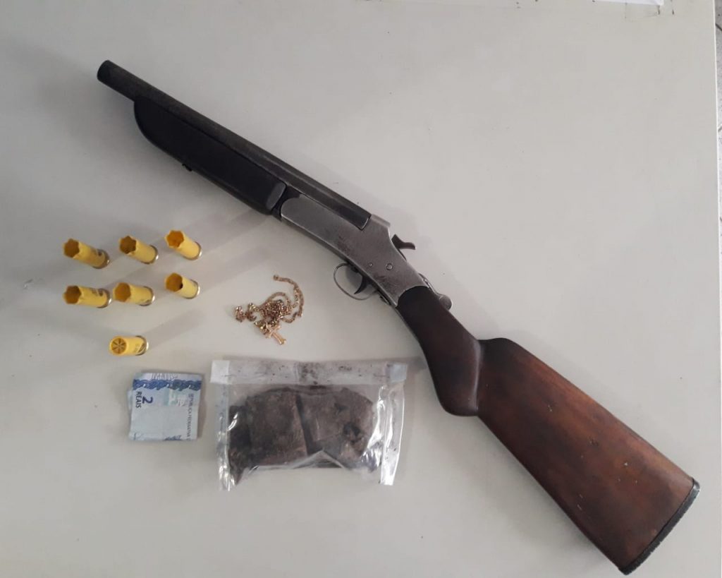 Na ação policial, foram apreendidos uma escopeta, sete cartuchos, sendo seis deflagrados e um intacto. Além de uma significativa quantia de maconha. O suspeito também era investigado por ameaçar uma figura pública do município de Capela.