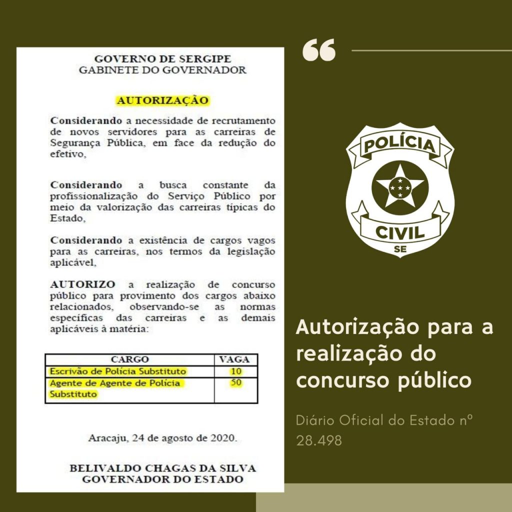 A autorização para a realização do concurso público para a Polícia Civil foi publicada no Diário Oficial do Estado, nº 28.498, dessa quarta-feira, 2 de setembro. O certame será realizado para o preenchimento de 50 vagas do cargo de agente de polícia judiciária e de 10 para escrivão de polícia substituto. O concurso público foi apresentado no dia 20 de agosto.
