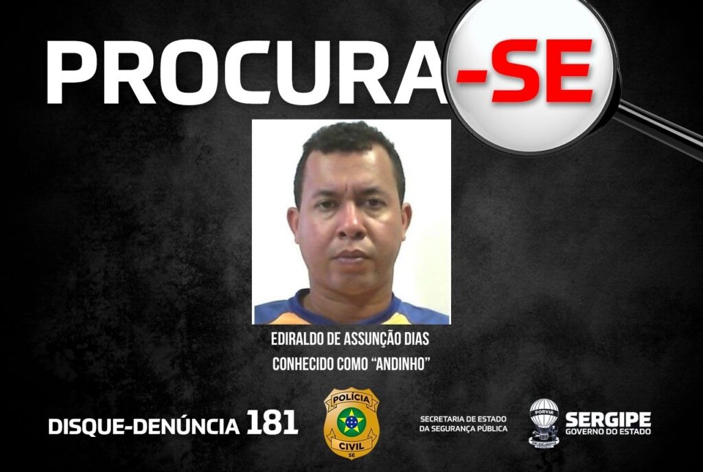 A Polícia Civil de Sergipe reforça que informações que possam contribuir para a localização de Ediraldo de Assunção Dias, o “Andinho”, podem ser repassadas de forma anônima e segura por meio do Disque-Denúncia 181.