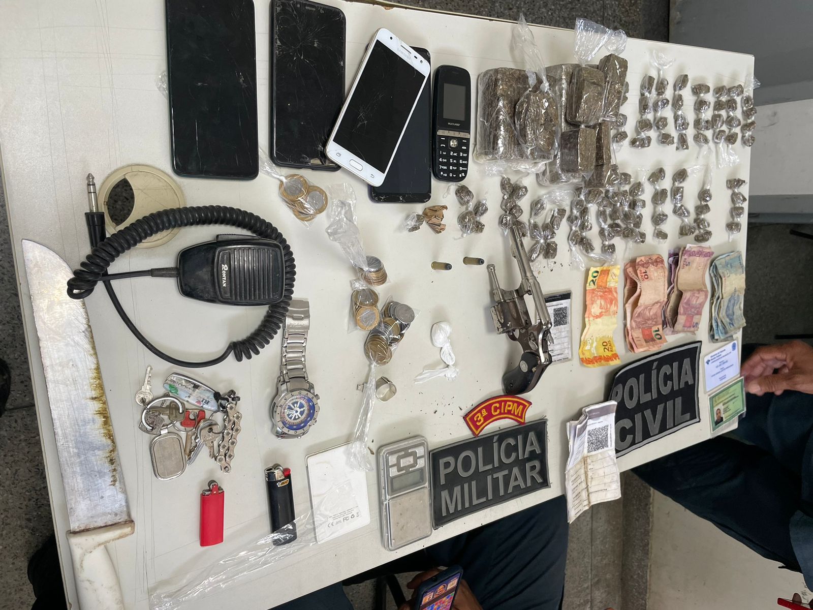 Na operação, foram apreendidos arma e drogas. O material apreendido foi encaminhado à delegacia, onde as investigações seguem em andamento.