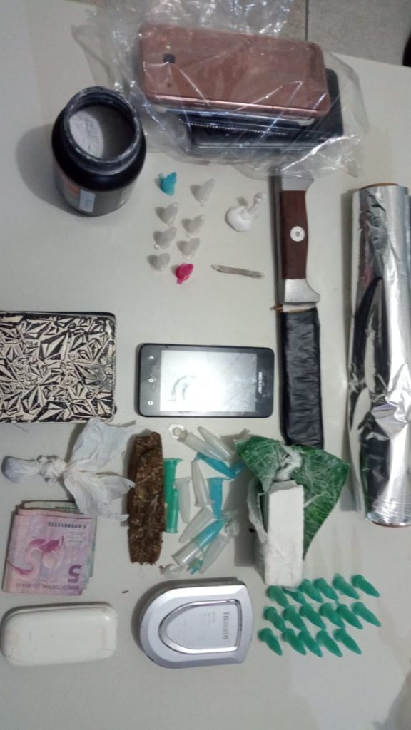Foram apreendidas substâncias semelhantes à cocaína e maconha, balança de precisão, dinheiro fracionado e materiais para fabricação de drogas