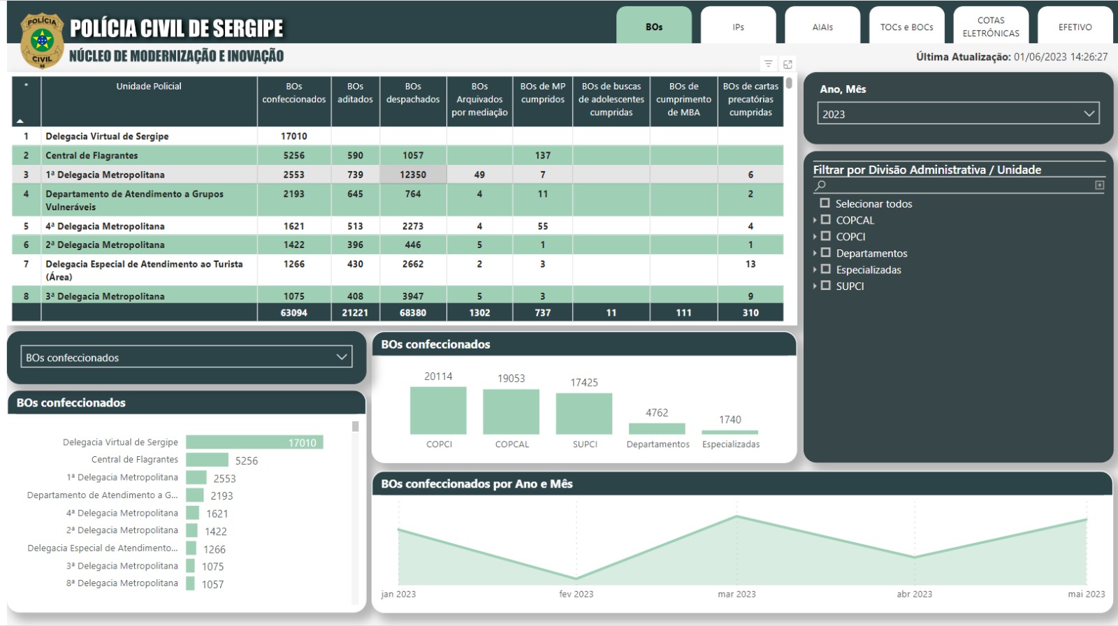 Com o objetivo de mapear informações qualitativas sobre o efetivo policial e reunir dados quantitativos e qualitativos sobre os procedimentos adotados pelas unidades vinculadas à Polícia Civil de Sergipe, a instituição adotou uma ferramenta de business inteligence, umadas principais do mundo em termos de análise de dados no universo corporativo e de negócios. Os dados reúnem informações distribuídas pelos principais tipos de procedimentos adotados no dia a dia da Polícia Civil de Sergipe.
