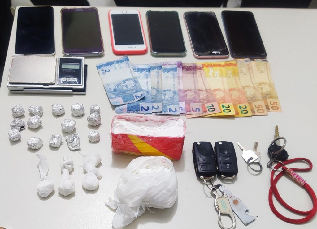No local, foram apreendidos 300 gramas de substância semelhante à cocaína, com três pacotes prontos para venda, e 20 gramas de substância semelhante à maconha, com 14 pacotes preparados para a comercialização. Na ação, os policiais também apreenderam uma balança de precisão, cinco celulares, dois carros e uma motocicleta.