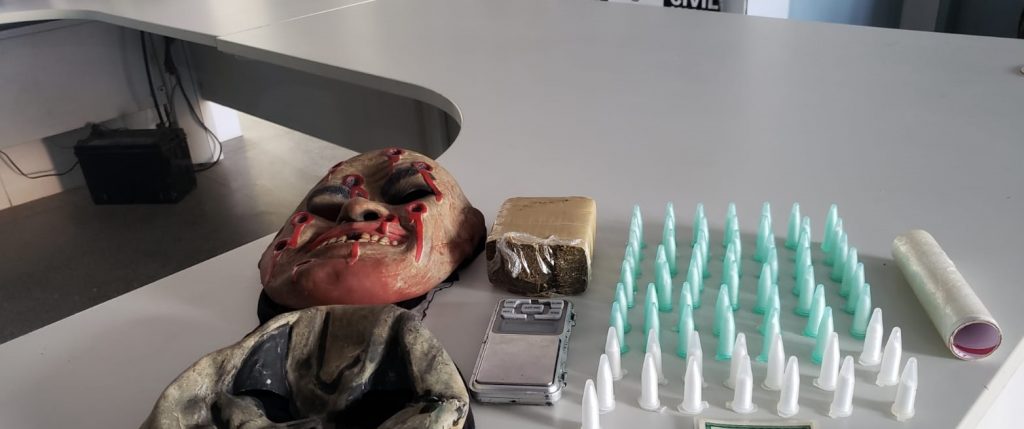 Durante a prisão, foram apreendidos entorpecentes, além de máscaras supostamente utilizadas para a prática de assaltos na região