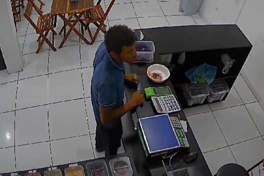 As imagens das câmeras de segurança mostram o momento em que um dos homens entra no local, serve-se e, ao chegar ao caixa, anuncia o roubo, ameaçando a funcionária com uma faca. O suspeito levou R$ 187 do caixa da loja.