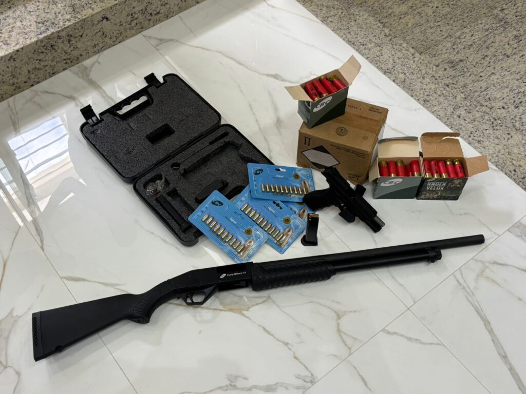 Na residência e empresa do investigado, foram encontradas duas armas de fogo, uma espingarda calibre .12 e uma pistola calibre .380, ambas sem documentação legal.