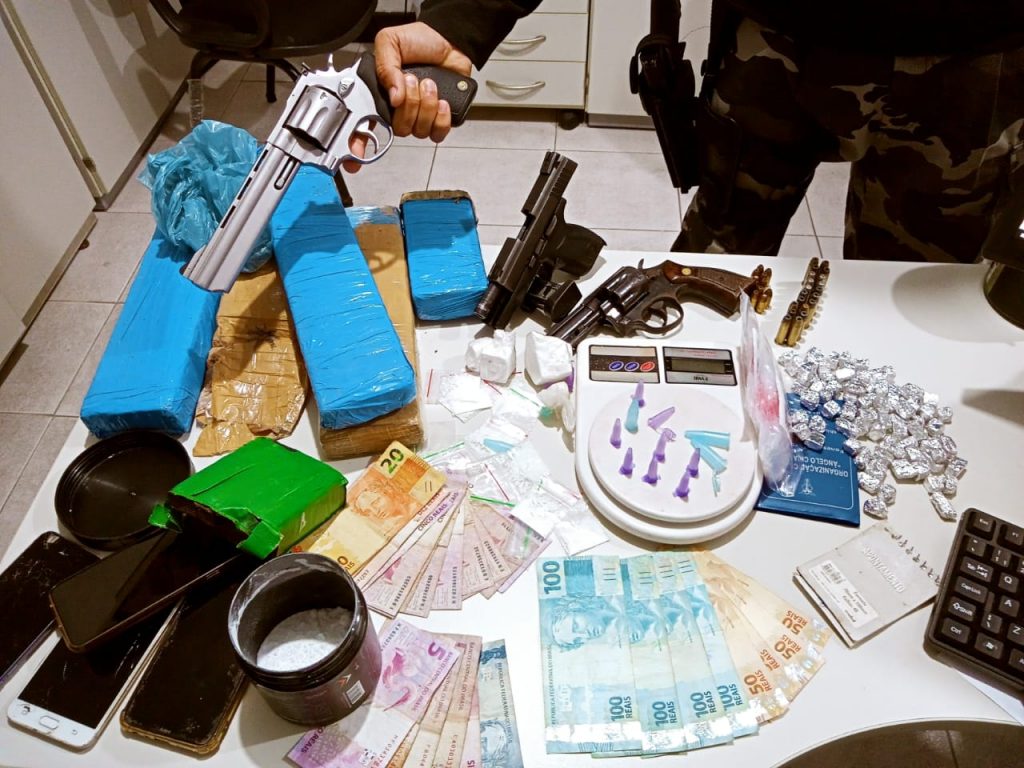Na residência de Lucas foram apreendidos uma pistola e munições calibre 380, trouxas de maconha e pinos de cocaína.