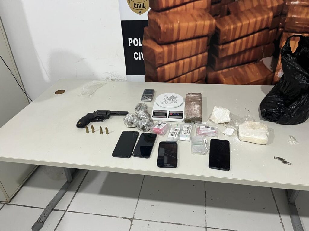 No interior do imóvel foram encontradas substâncias com características de maconha, crack e cocaína, além de um revólver calibre 38, balanças de precisão, sacos plásticos utilizados para embalar as substâncias, dinheiro e aparelhos celulares;