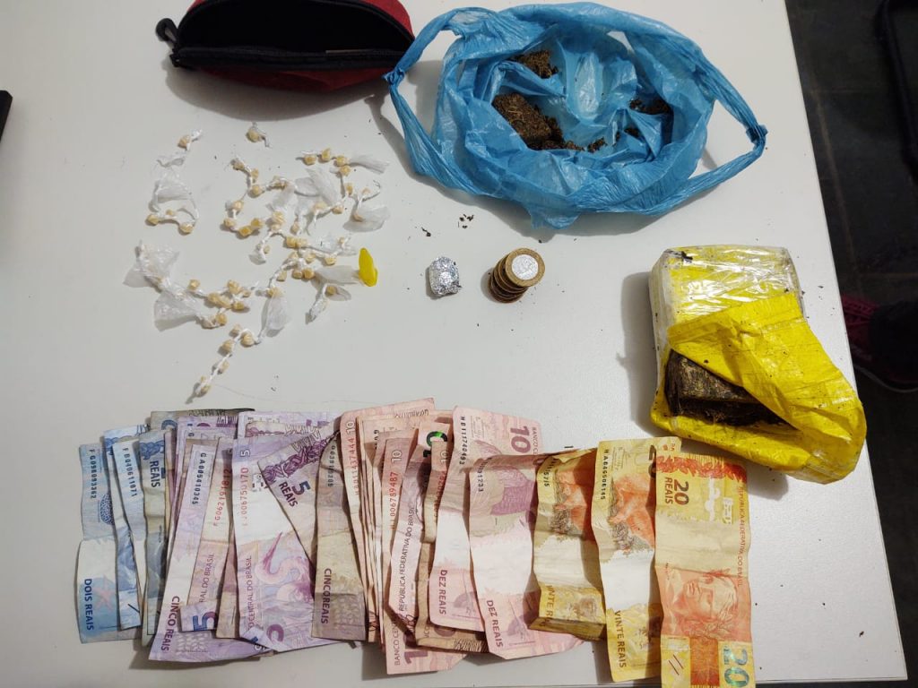 Com o suspeito foram encontrados dinheiro em espécie, cápsula de acondicionar cocaína, 56 embalagens plásticas contendo pedras de crack prontas para venda, maconha granel e um tablete de maconha prensada.