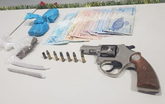 Na abordagem policial, foram encontrados uma arma de fogo, do tipo revólver, seis munições intactas e uma deflagrada, tabletes e cigarros de substâncias entorpecentes semelhantes à maconha, além de dinheiro trocado. O material estava no interior da residência que funcionava, aparentemente, como um local de conserto de celulares. Os envolvidos foram encaminhados à delegacia.
