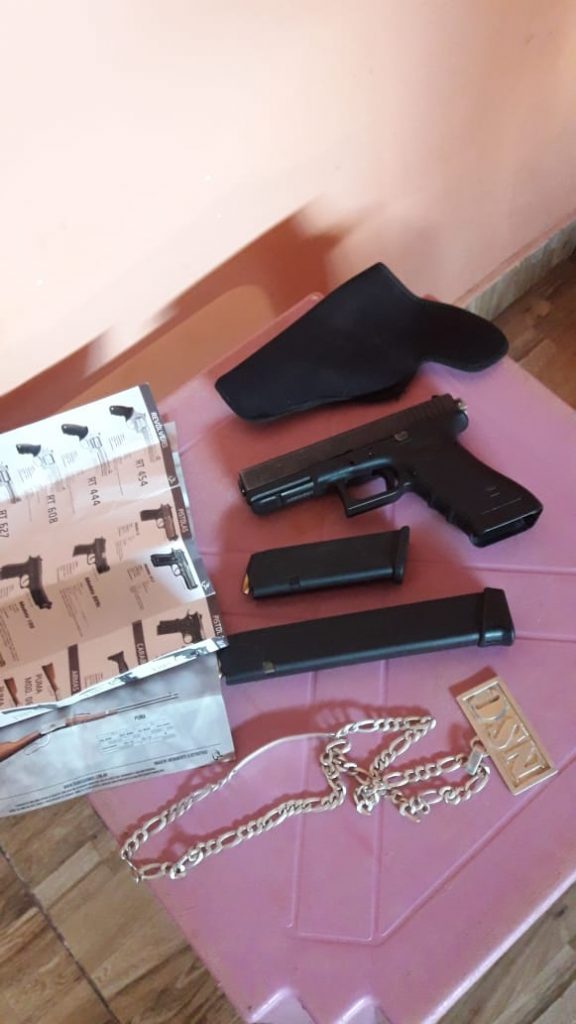 De acordo com as informações repassadas, os policiais receberam um Disque-Denúncia de que Eider estaria transitando em via pública, portando uma arma de fogo, o que chamou a atenção dos populares. Por volta do meio-dia de hoje, 21, a equipe policial foi até a casa do suspeito e encontraram uma pistola glock 9mm municiada com dois carregadores.