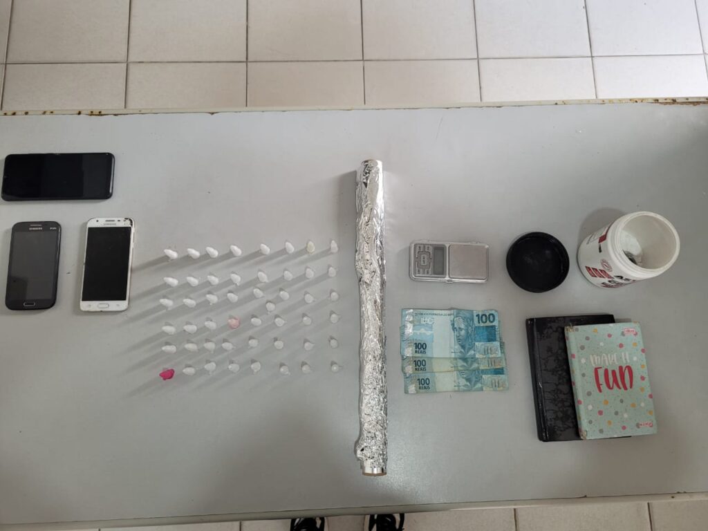 Além da mulher, foram encontrados 49 pinos de cocaína, celular, balança de precisão e um caderno de anotações, itens usados para o tráfico de drogas. Os três suspeitos foram presos e estão à disposição do Poder Judiciário.
