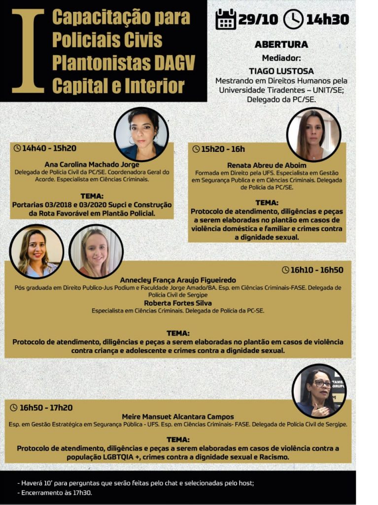 Já no dia 29, o curso tem início às 14h30, com a mediação do delegado Thiago Lustosa. Às 14h40, as instruções têm a participação da delegada Ana Carolina Machado. Em seguida, às 15h20, o curso conta com a presença da delegada Renata Aboim. Em continuidade, às 16h10, as instruções são com as delegadas Annecley Araujo e Roberta Fortes. Às 16h50, o curso recebe a delegada Meire Mansuet.
