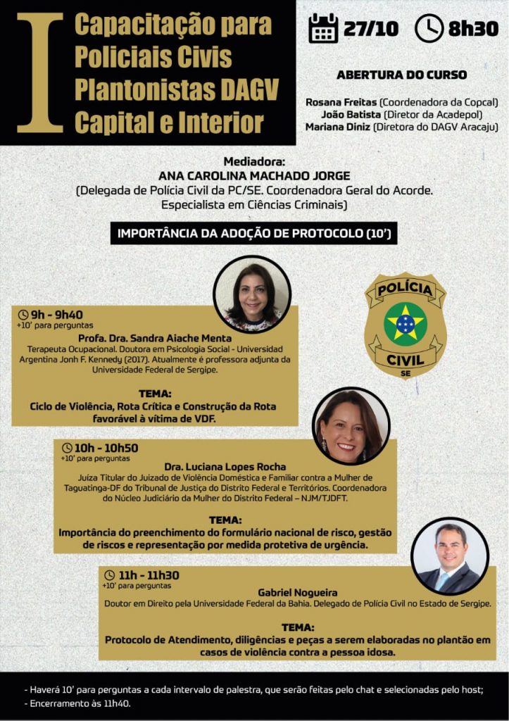 Na primeira turma, que tem início no dia 27 de outubro, a abertura do curso ocorrerá às 8h30, com a participação da coordenadora da delegacias da capital, Rosana Freitas, do diretor da Academia de Polícia Civil (Acadepol), delegado João Batista, e da diretora do DAGV Aracaju, delegada Mariana Diniz.