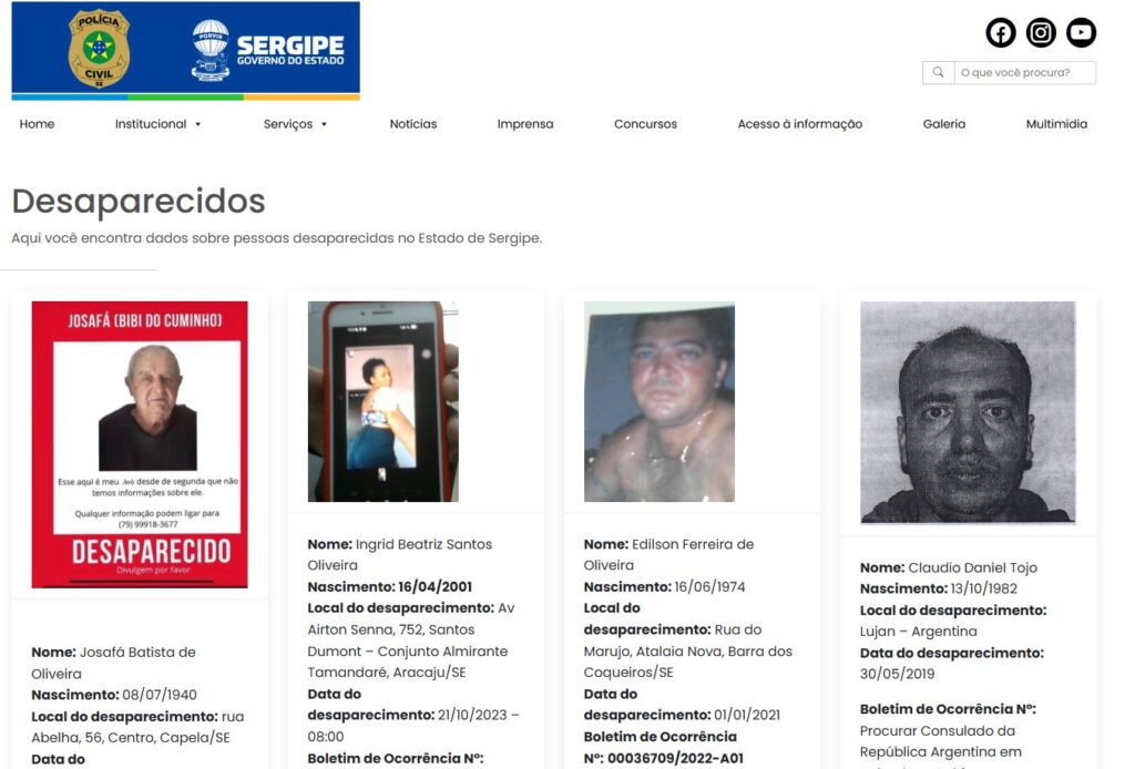 O site da Polícia Civil conta com uma seção onde e há imagens e dados das pessoas desaparecidas em Sergipe. As informações podem ser consultadas no link: https://www.policiacivil.se.gov.br/desaparecidos/ . Caso identifique alguma pessoa que apareça na lista, entre em contato com a Polícia Civil, inclusive pelo Disque-Denúncia, no telefone 181.