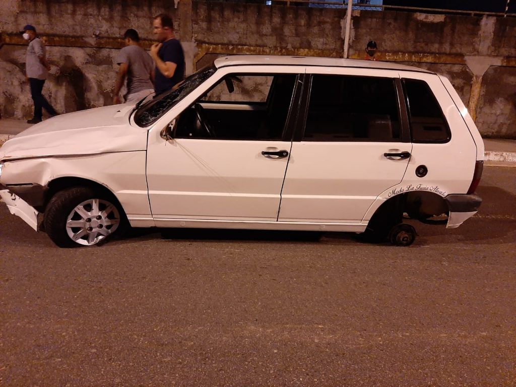 Com o impacto, os pneus do carro foram deslocados, o veículo atravessou o sentido contrário e ainda colidiu frontalmente com uma moto que vinha na outra via, deixando o condutor da motocicleta ferido.
