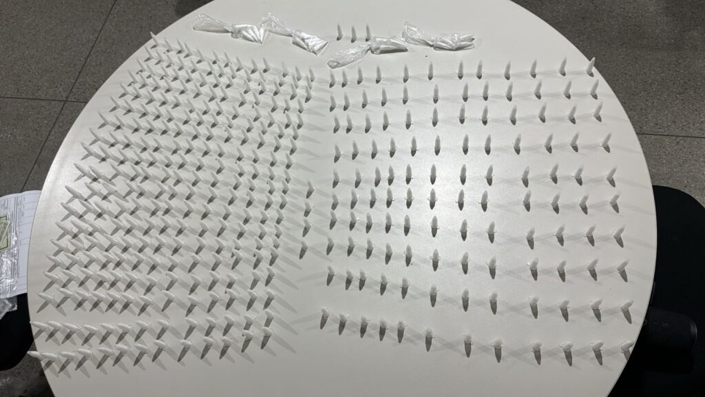 Diante da confirmação sobre a existência de mais drogas, os policiais foram à rua Baião de Dois, localizada no bairro Luiz Gonzaga. Na casa do suspeito, os policiais encontraram cerca de 370 pinos de cocaína escondidos no guarda-roupa.