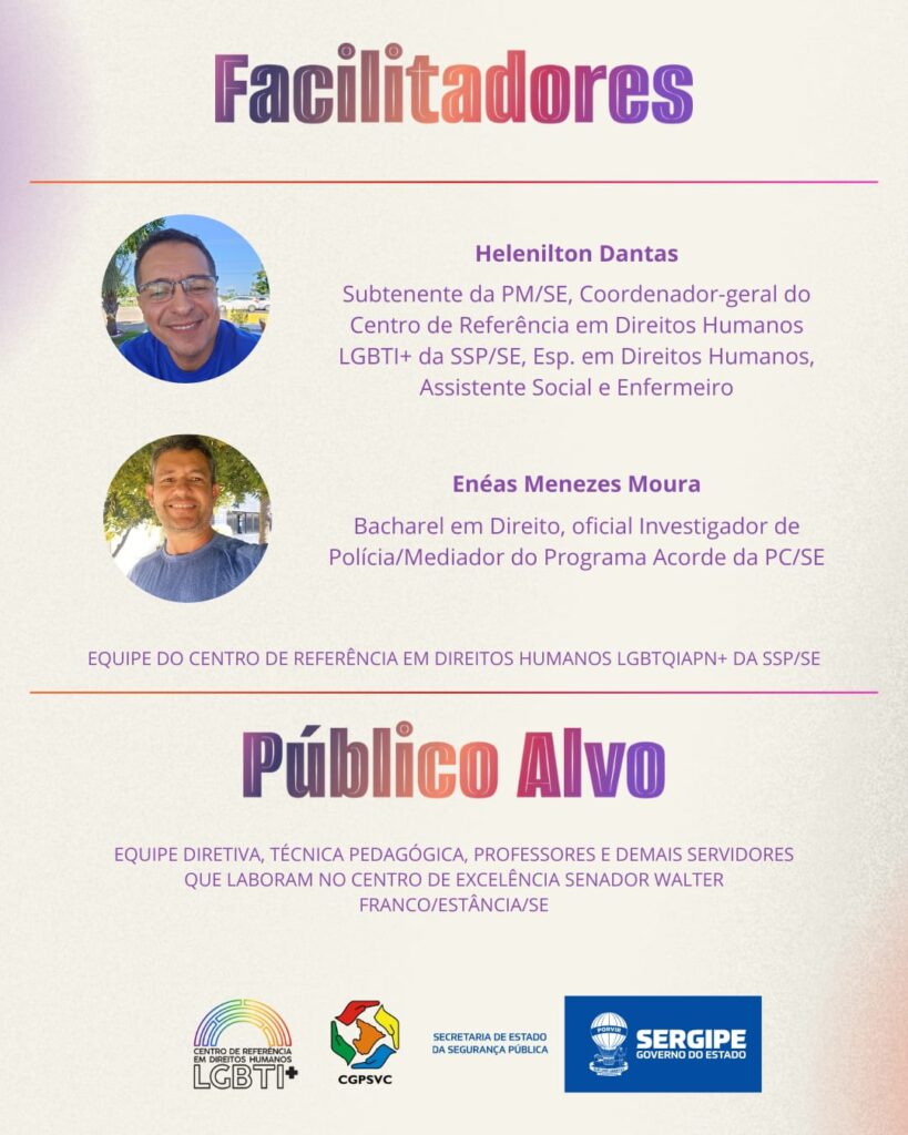 A capacitação também busca articular a rede de apoio voltada às causas do público LGBTIAPN+, para ampliar potencialmente o alcance dos articuladores envolvidos nesse tipo de política pública. O evento terá à frente integrantes da SSP, especificamente das Polícias Civil e Militar do Estado de Sergipe.